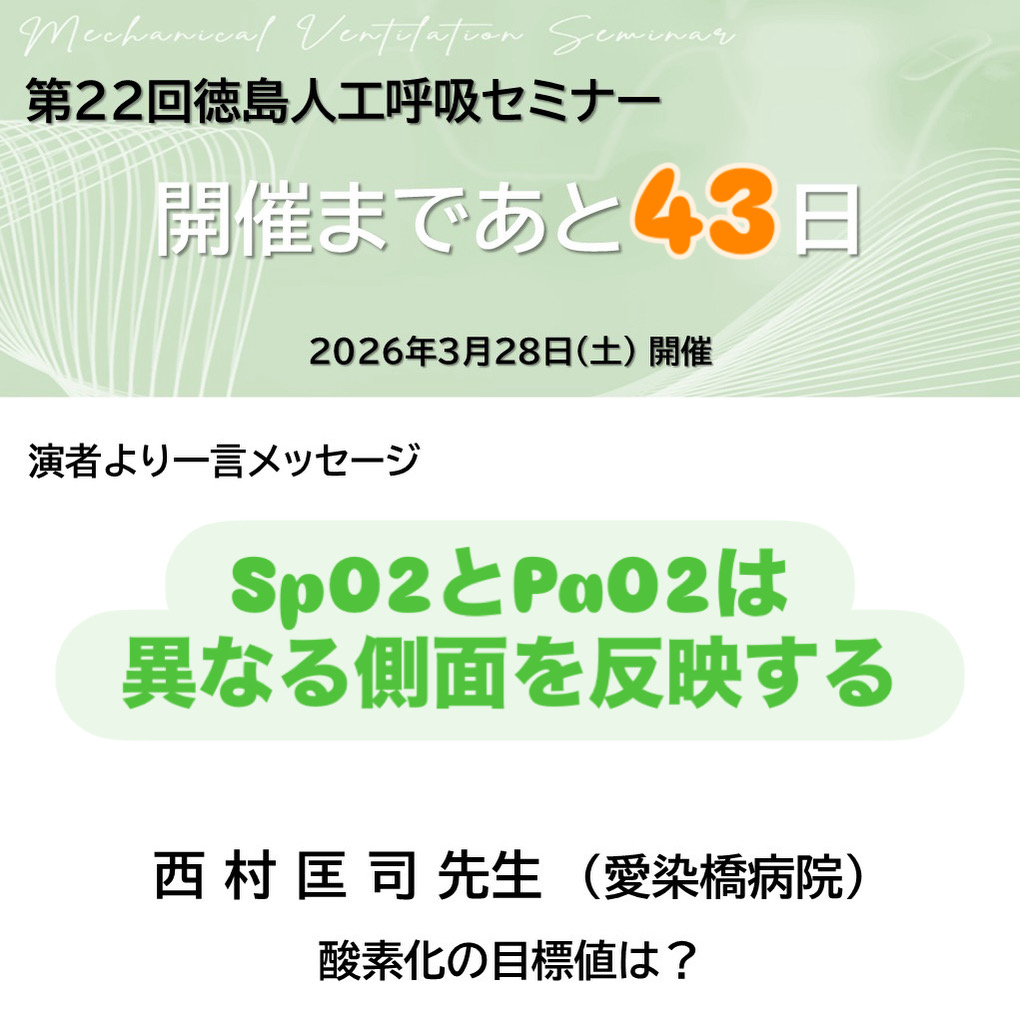 開催まであと43日! 2026 2/13 第22回徳島人工呼吸セミナーまであと43日✨講師からの一言メッセージ、一周まわってまだまだ続きます!!わたしたちと一緒に、呼吸を究める一年にしませんか📖参加登録はこちらから💁♂️https://tokushima-vs22.peatix.com/view#徳島人工呼吸セミナー #呼吸療法認定士 #徳島大学病院 #集中治療 #酸素療法1h お知らせ セミナー情報