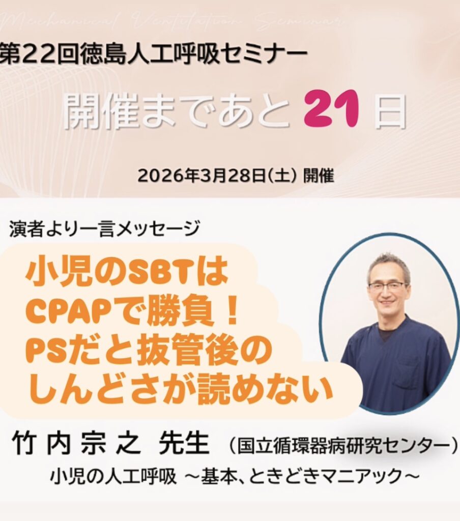 第22回徳島人工呼吸セミナーまであと15日✨✨✨ 演者からの一言も、3ラウンド目に突入しています。 みんなで気持ちを盛り上げて参りましょう!! さあ、呼吸管理を、あなたの武器に。 参加登録はこちらから💁♂️https://tokushima-vs22.peatix.com/view 【... -